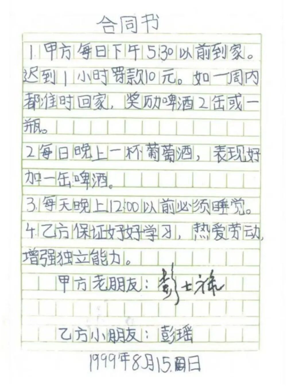 外孙女彭瑶青睐姥爷,便用稚嫩的笔迹写下这份“公约书”,但愿用“奖励啤酒”的格局,督促他准时回家、依期休息。